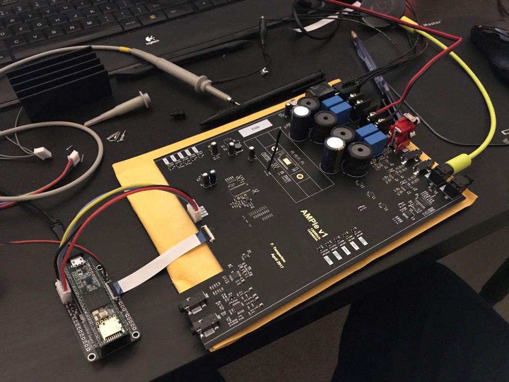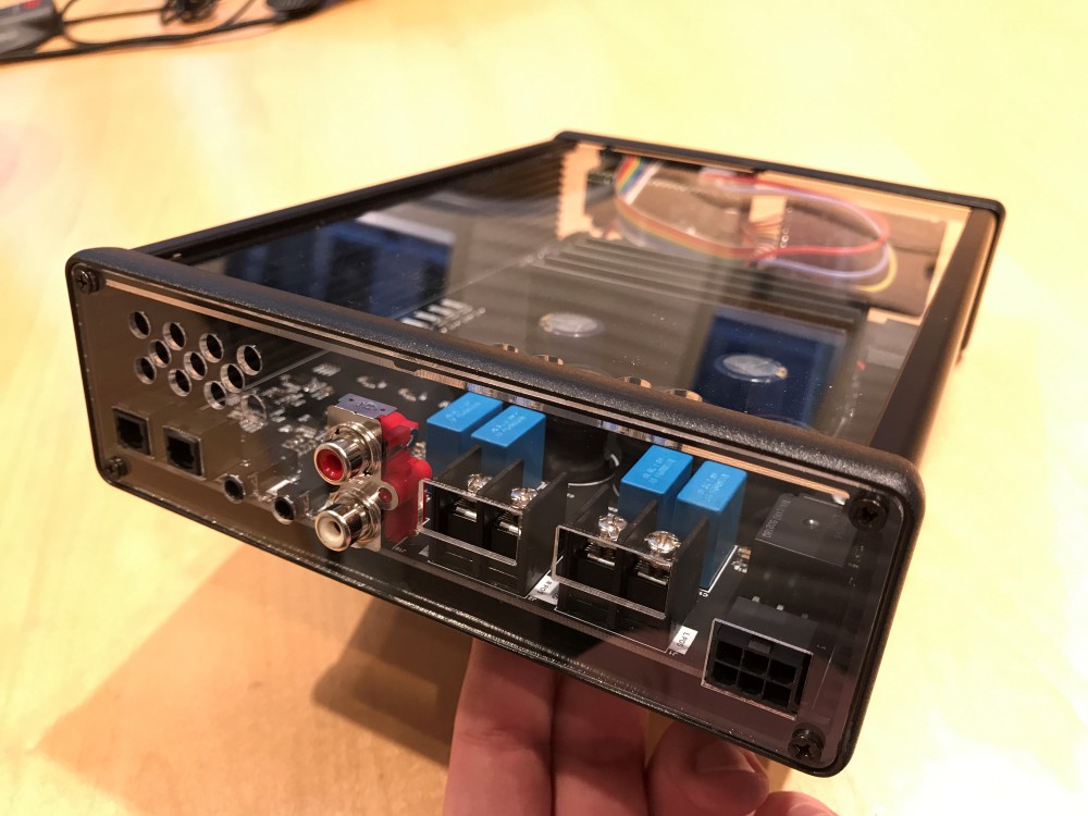 The main features of the amplifier are to take 2 optical inputs from my TV and a Chromecast Audio, decode, EQ and amplify for my speakers. The amplifier is capable of 150W/channel which is more than enough to find the resonant frequency of various objects around the apartment. A small screen and IR receiver finished it off and it was boxed up alongside a power supply unit which handles the 5, 12 and 36V rail generation.