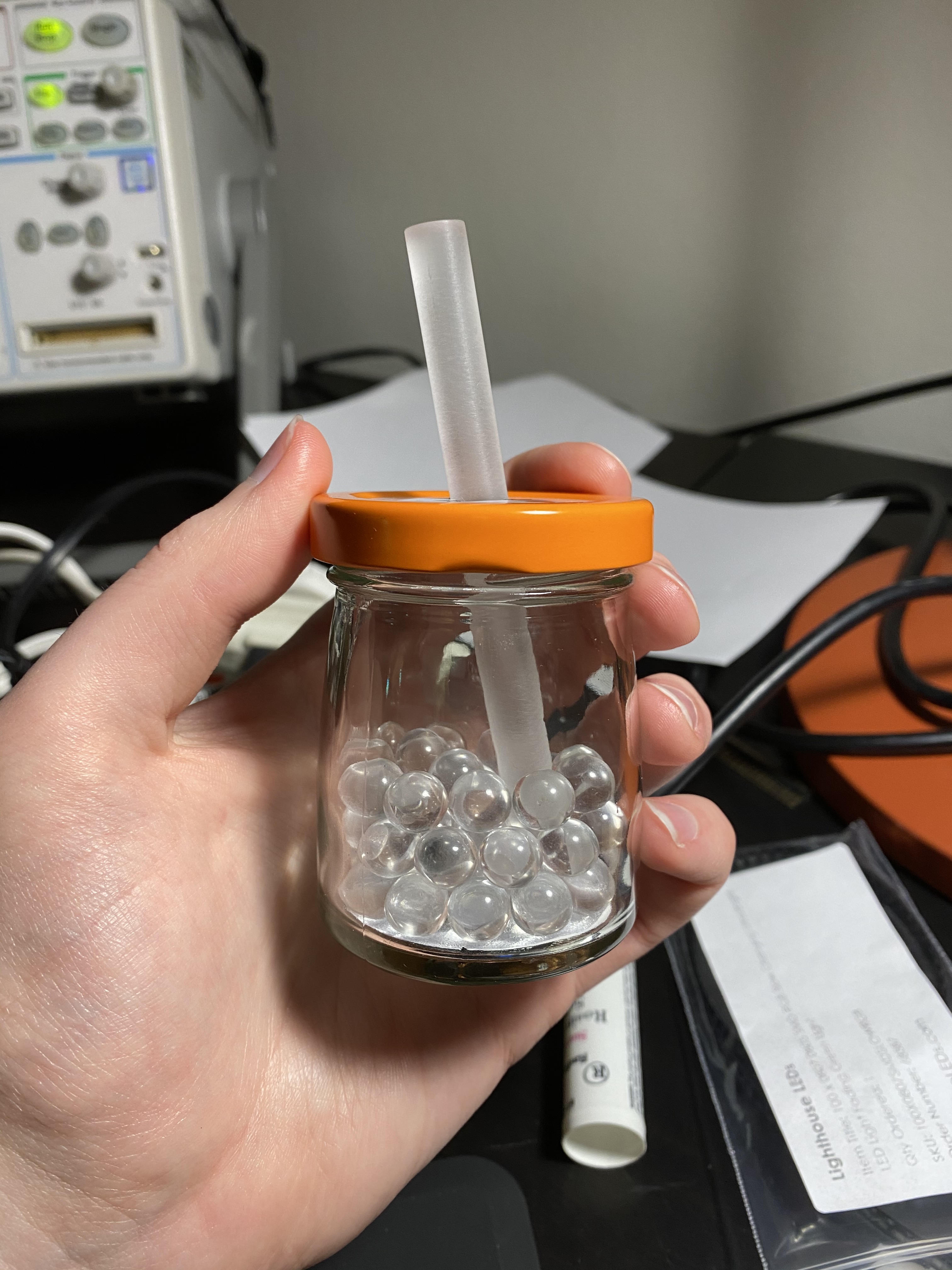 A quick little trinket using an off-the-shelf Qi transmitter and receiver and some slow-fade RGB LEDs. They illuminate some acrylic balls and ‘straw’ for a fun little effect