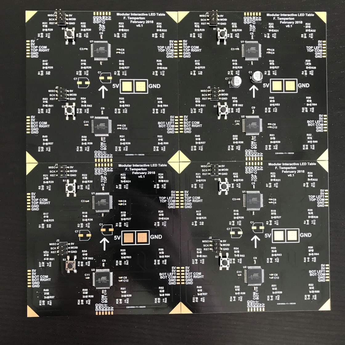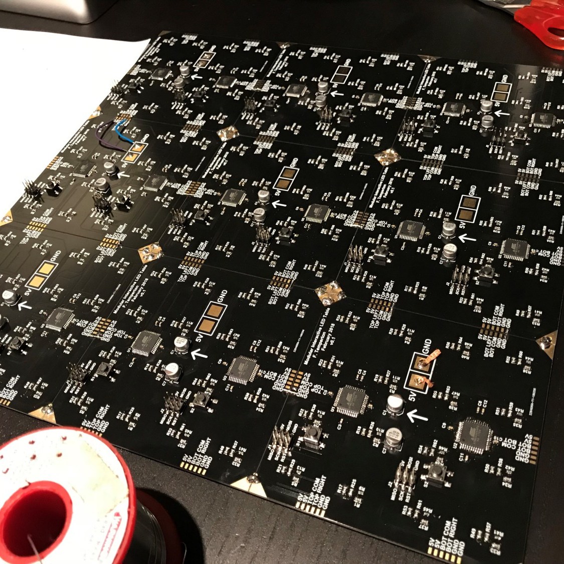 The design was based off a product called Octolively from Evil Mad Scientist and I designed a custom PCB designed to be tiled. Every single white LED also has a IR Tx and Rx pair around it so you can proximity sense for every single node. This worked well in small sections, however when assembled into a large matrix, pixels started triggering each other.