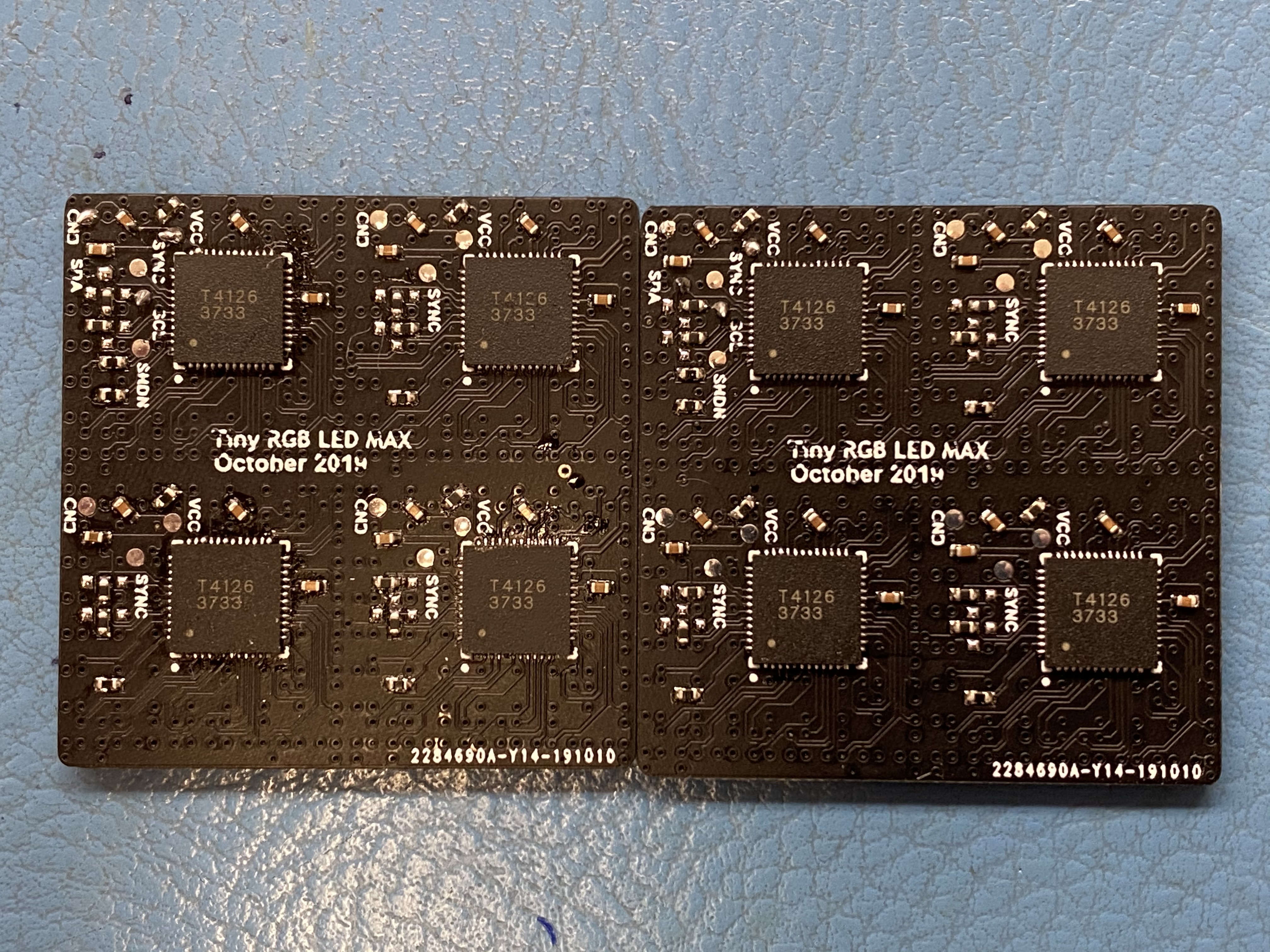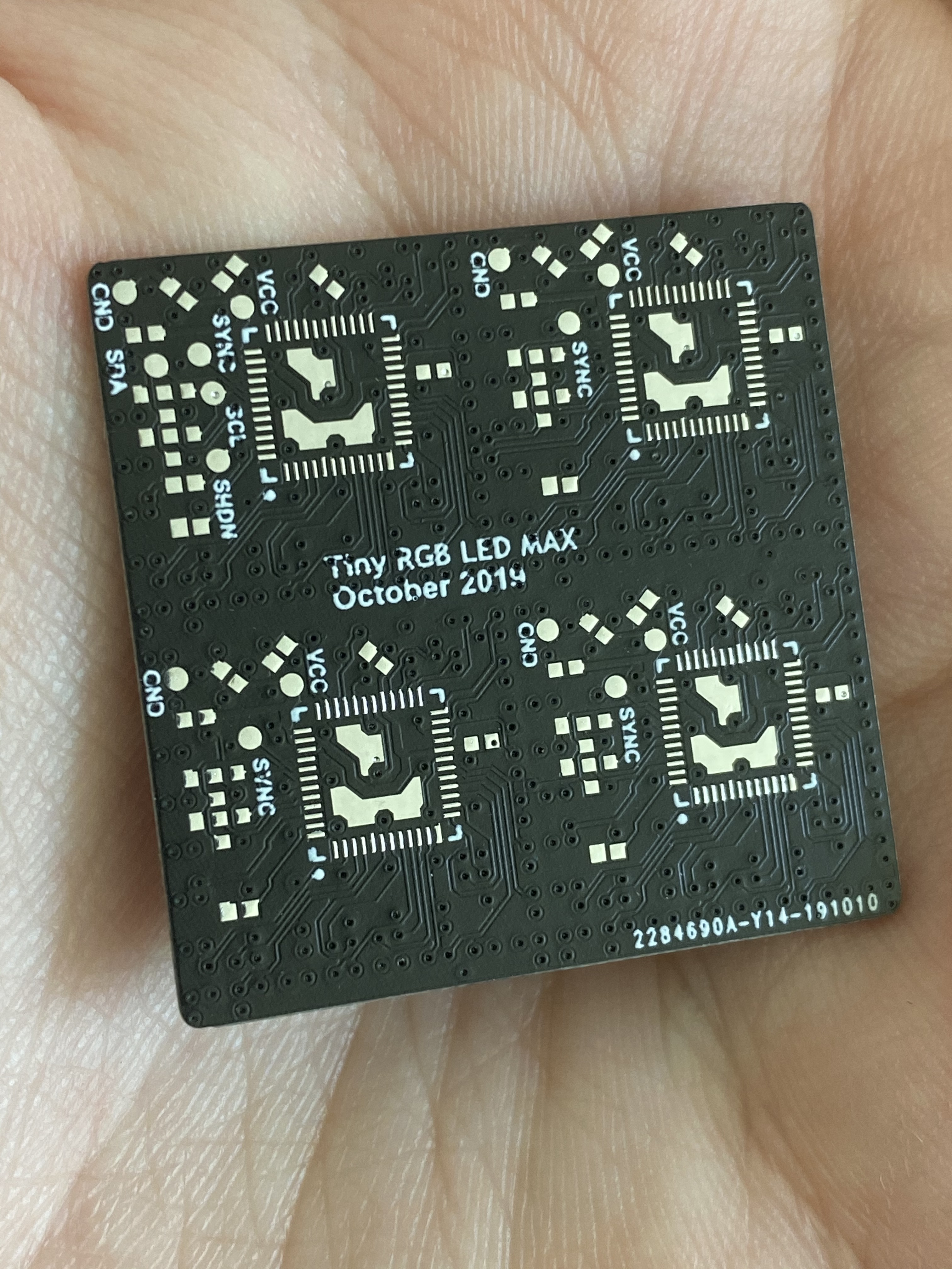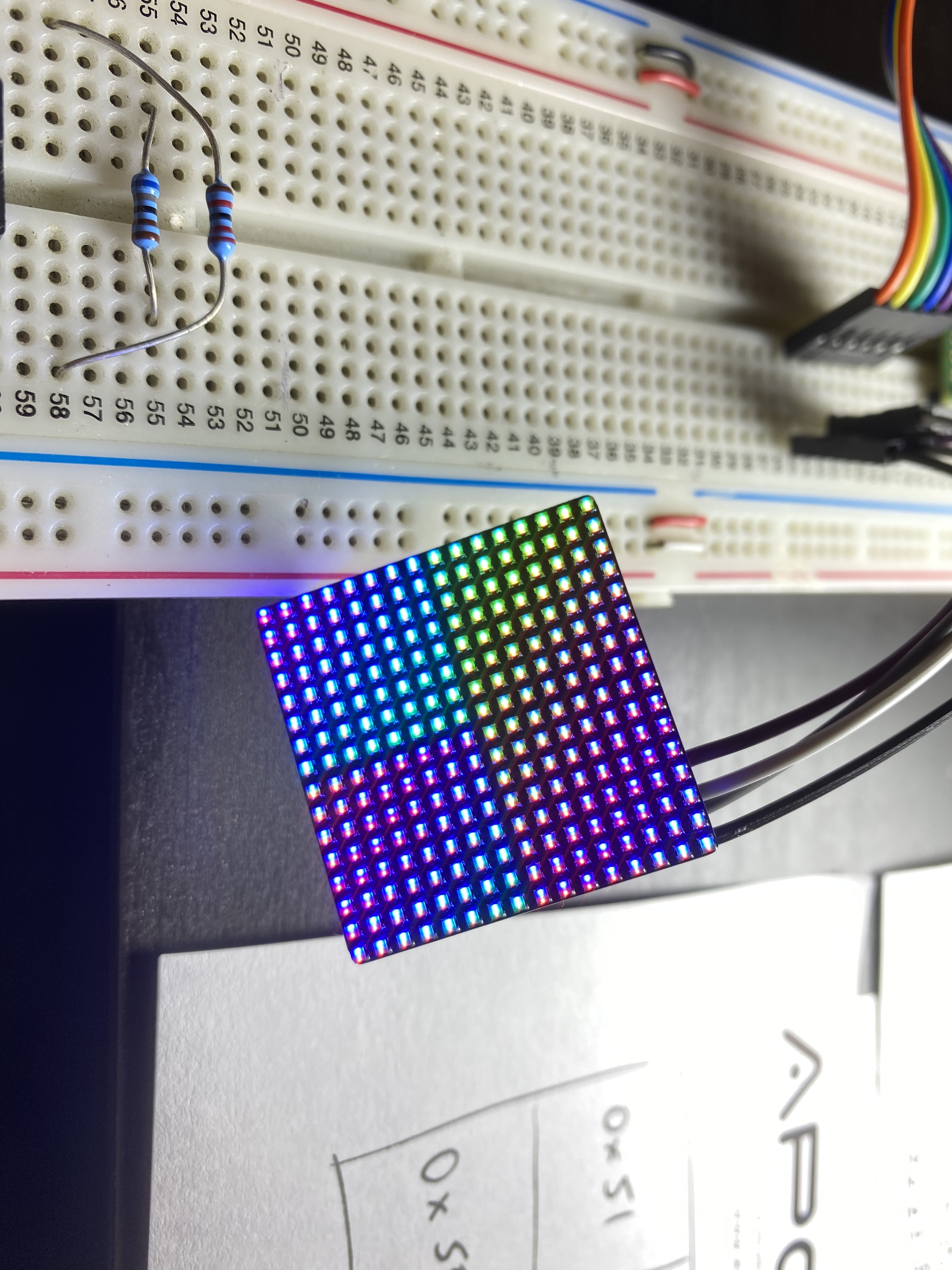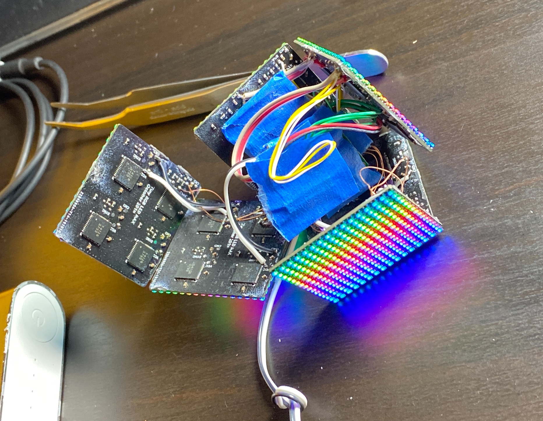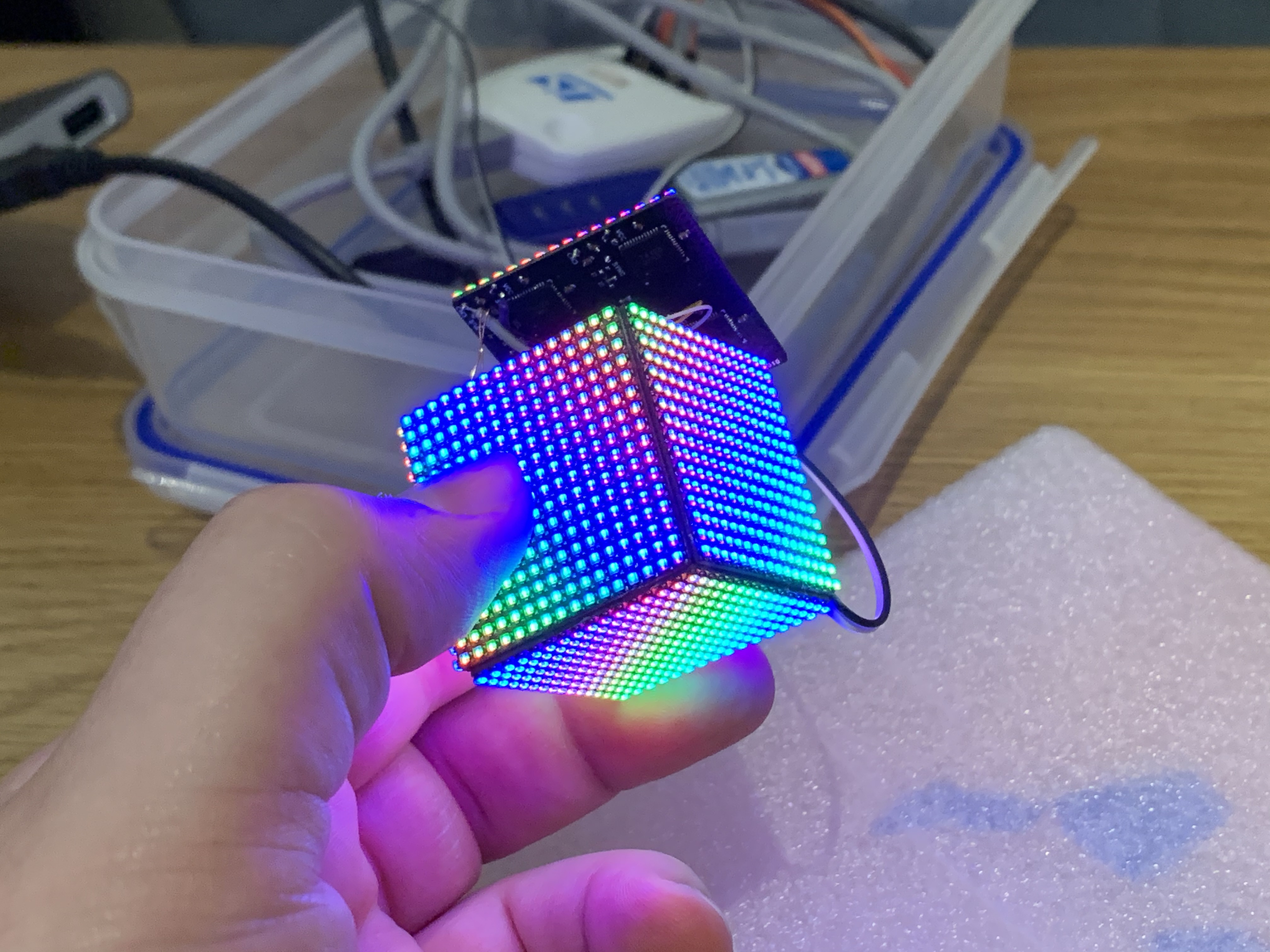 The LED Matrix panels are just 4 of the smaller ones joined together and uses the same MCU board to run it. This time with an accelerometer added, so the rainbow animation always flows downwards. The cube is powered from 5V through a USB cable this time and I took it to the 2019 Hackaday Superconference to show off