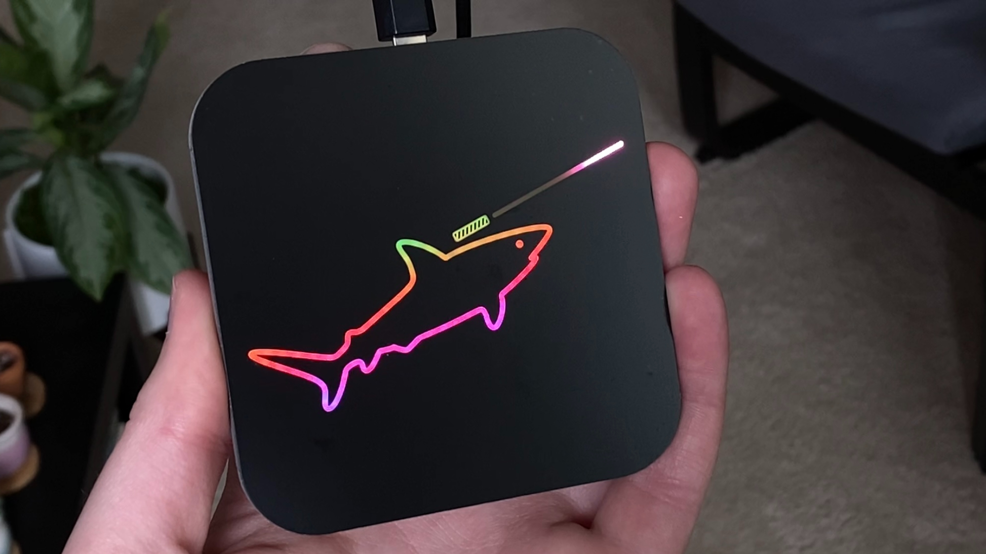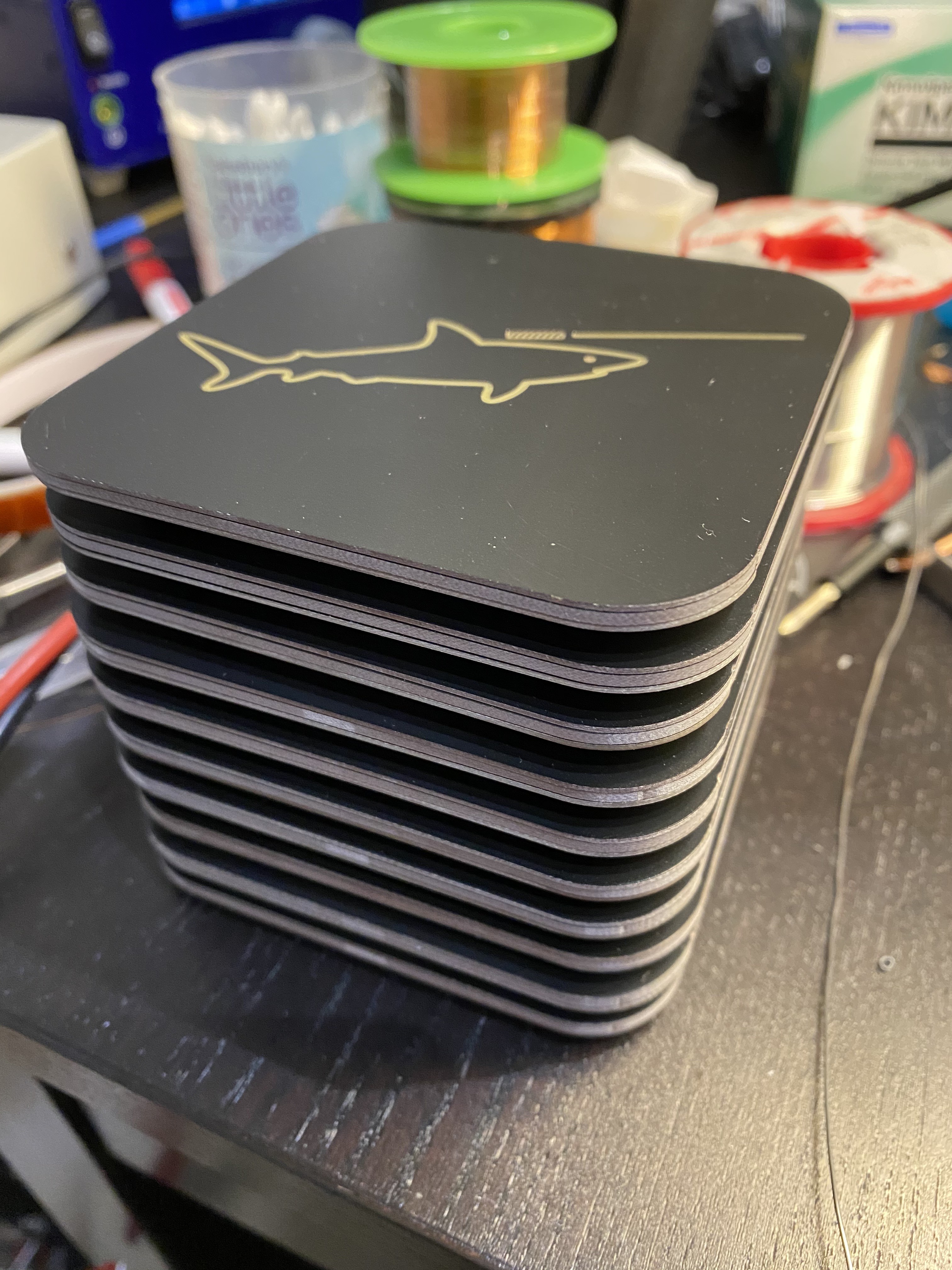 Made a small production run of shark coasters for some coworkers. It fires the laser when you tap it when sitting, changes colour depending on the temperature and goes into full rainbow mode when you pick it up!