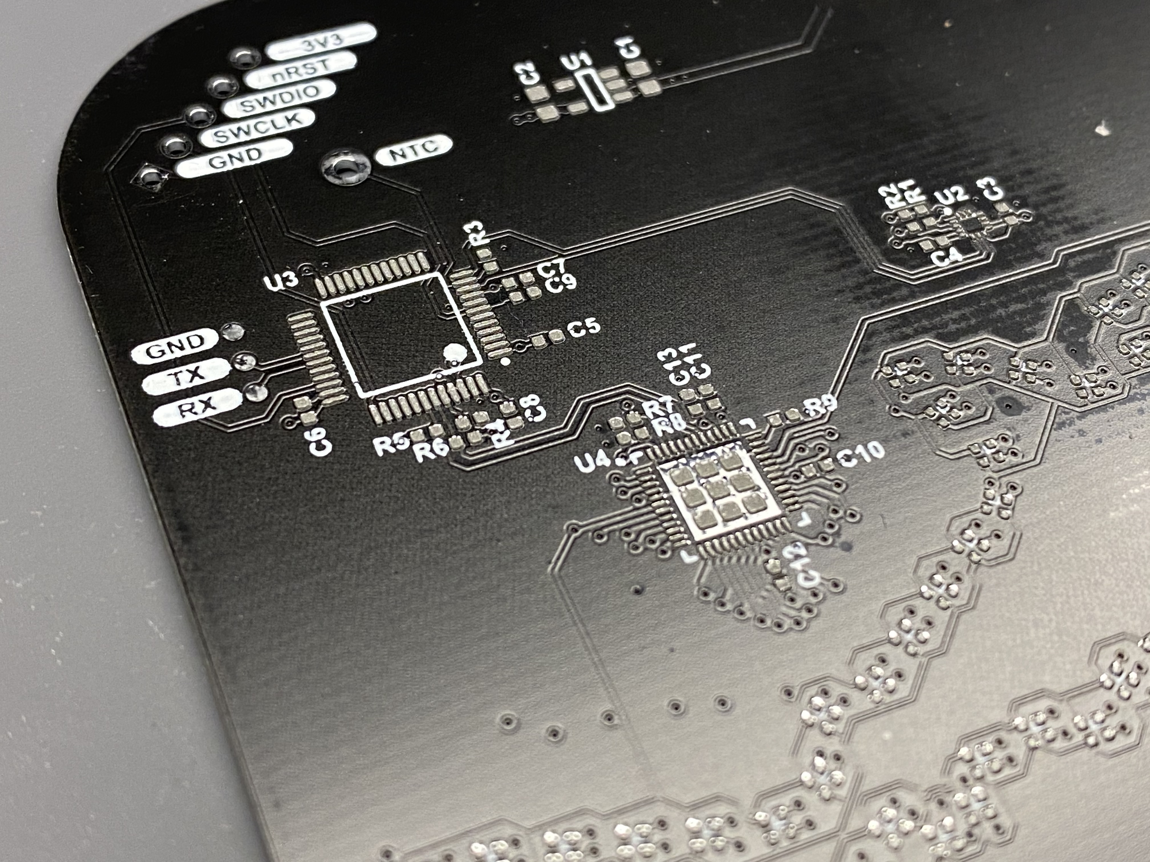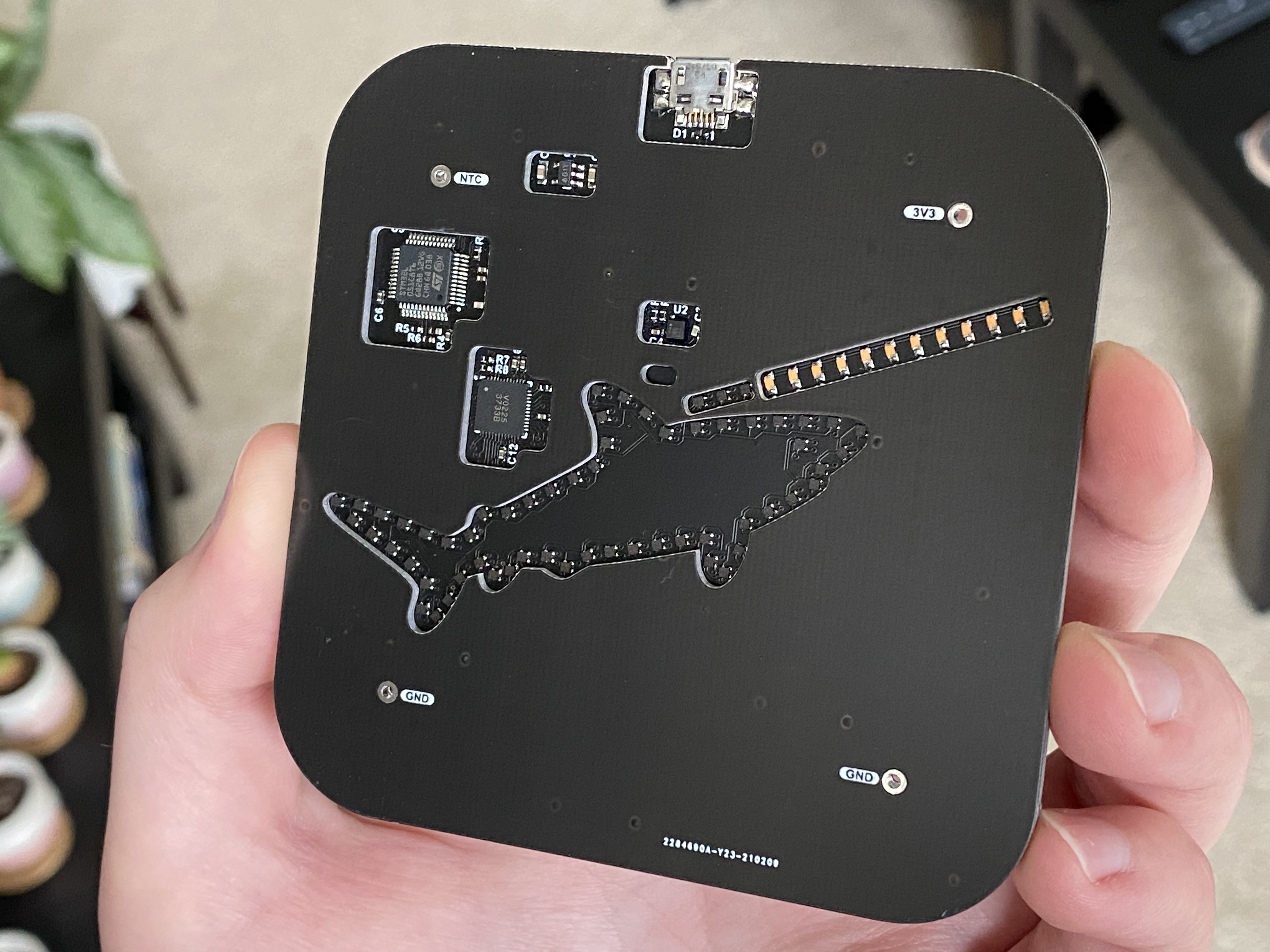 Achieved with a stack of 3 PCBs soldered together, which also serves to connect the NTC from the back of the top most PCB. STM32L051 powering it with an IS32FL3733 LED driver and LIS2DH accelerometer, powered through a micro USB port